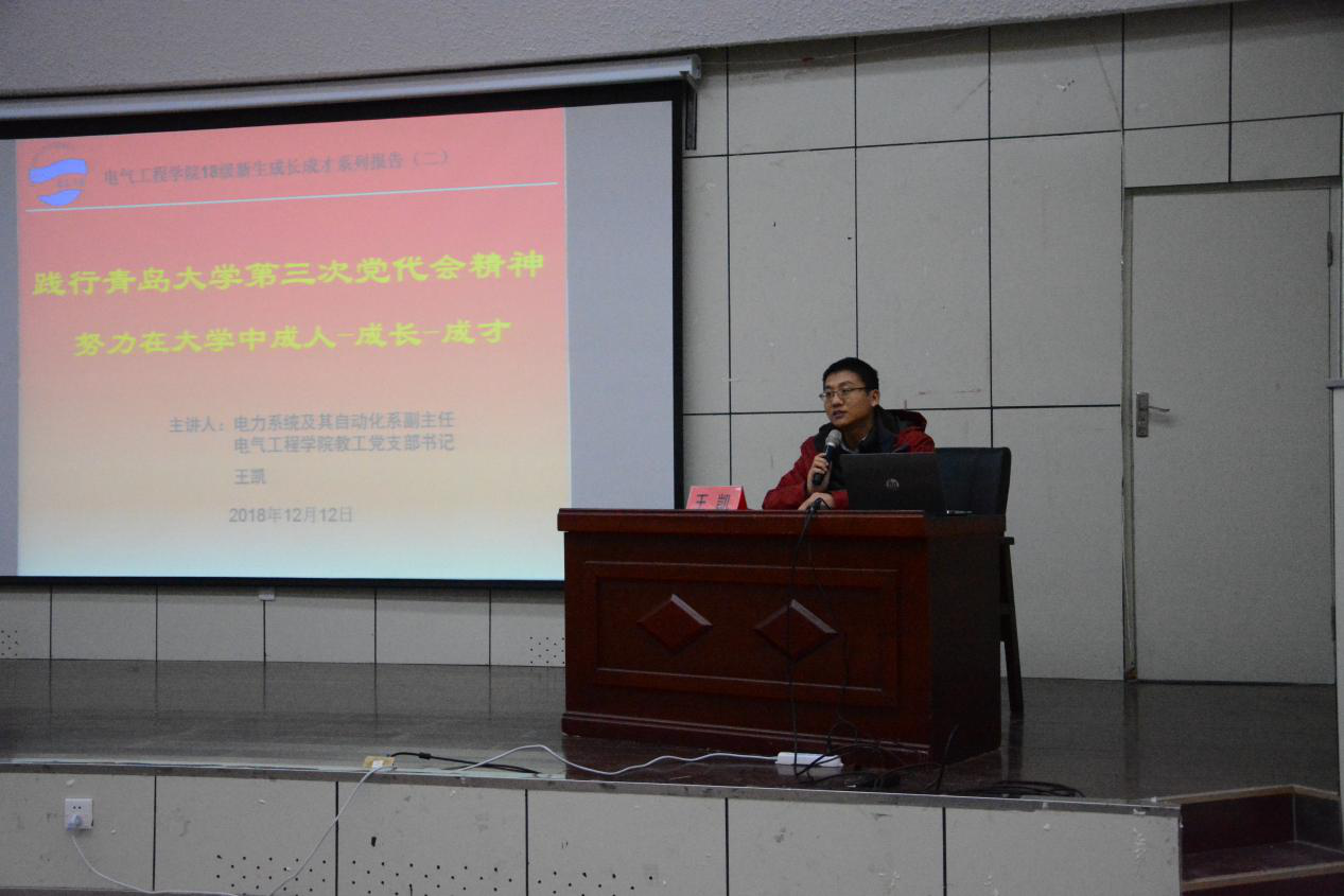 2018年12月12日下午15点30分,2007so太阳集团学生会于图书馆报告厅成功举办了“践行太阳集团2007第三次党代会精神,努力在大学中成人-成长-成才”的“博远讲堂”成人成才系列报告(二)。本次讲座以团支部为载体,邀请电力系统及其自动化系副主任、2007so太阳集团教工党支部书记王凯老师为全院学生作报告。