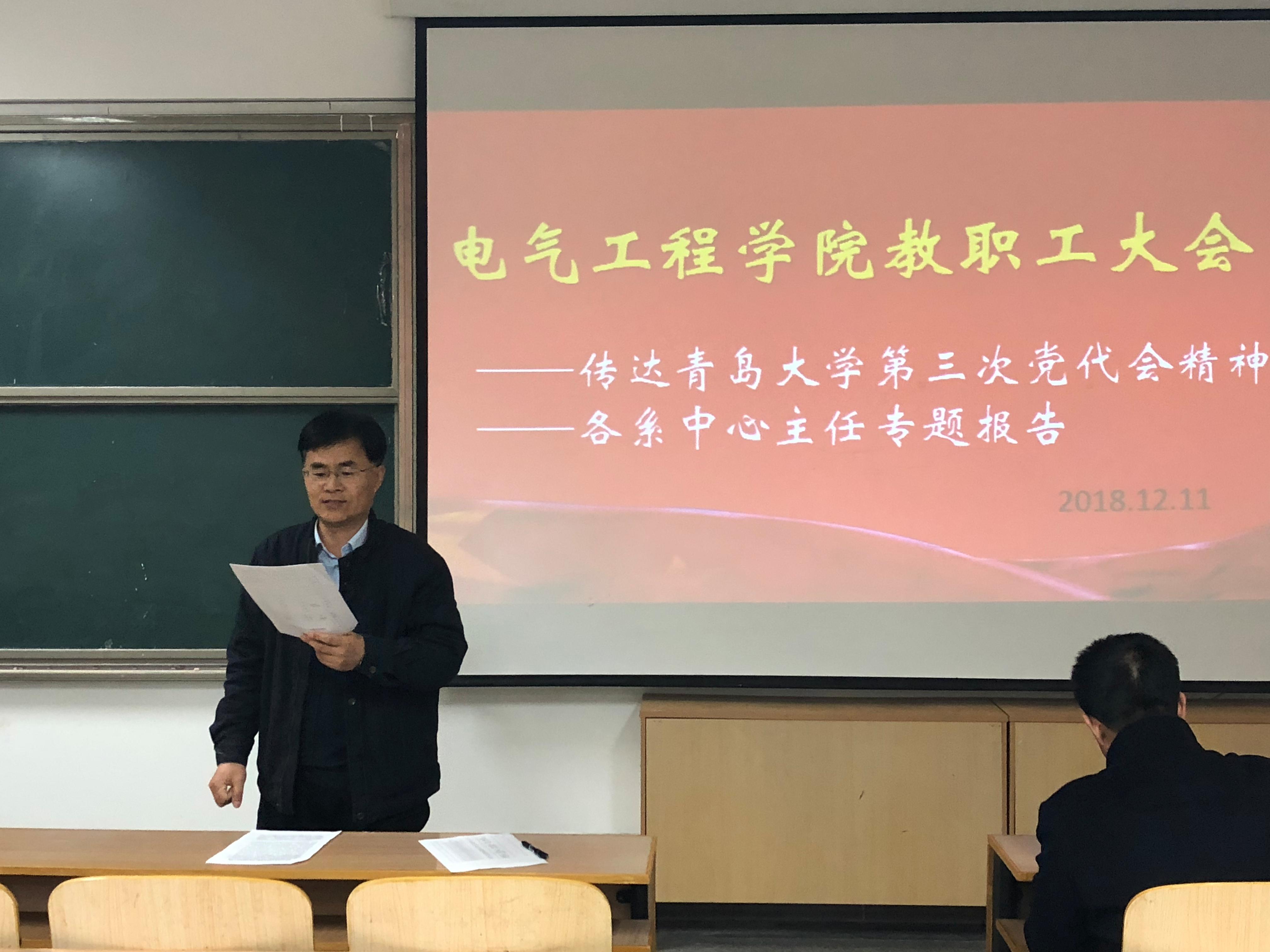 12月11日下午,2007so太阳集团召开全体教工大会,集中传达学习学校第三次党代会精神,同时结合学院工作实际和学科专业特点,学院各系中心主任围绕未来一年多的重点工作任务作了专题汇报交流,以实际行动掀起学习贯彻落实校党代会精神的热潮。院长陈道炼主持会议。