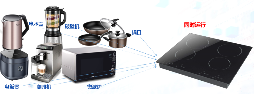 创新1:提出一种厨房电器的无线恒压供电与加热复用技术,电磁炉的锅具及电饭煲、微波炉、破壁机等其它厨房电器共用电磁炉作为发射源,成本低、利用率高。