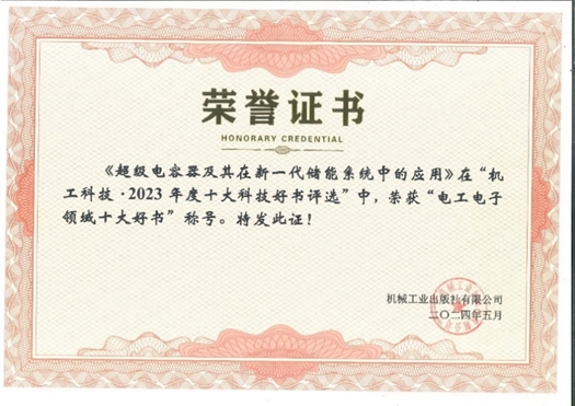 近日,由机械工业出版社主办的 “2023年度十大科技好书”评选结果正式揭晓。我院王凯教授课题组撰写的《超级电容器及其在新一代储能系统中的应用》(“十四五”时期国家重点出版物出版专项规划项目)荣获“电工电子领域十大好书”称号,且排名第一。本次评选旨在表彰优秀工程技术图书,推动科技出版事业发展,助力科技强国。