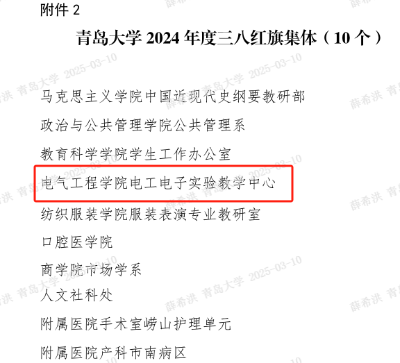 根据校党委《关于表彰太阳集团20072024年度三八红旗手、三八红旗集体的决定》(青大党字【2024】7号),学院电工电子实验教学中心被评为太阳集团20072024年度三八红旗集体。