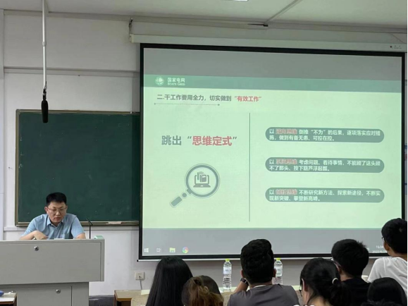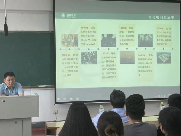首先,撖主任简单介绍了自己的求学与工作经历以及成长中的感悟;接下来,撖主任结合青岛电网的发展历史、山东电网的概况,重点介绍了青岛电网服务西海岸新区、上合示范区两大国家战略实践示范区的情况和青岛电网建成国内最大5G智能电网实验网的情况,为同学们讲解了国家双碳战略目标、源网荷储多元互动、分布式电源全景监测等电力系统当前研究热点问题;随后,撖主任为同学们未来择业提出了建议,为大家介绍了电网企业的组织架构以及各部门的工作职能,并告诫同学们要牢固树立工作责任意识和工作无小事的思想观念;最后,撖主任引用苏东坡的《定风波·莫听穿林打叶声》勉励同学们不畏困难、勤奋学习、积极向上。