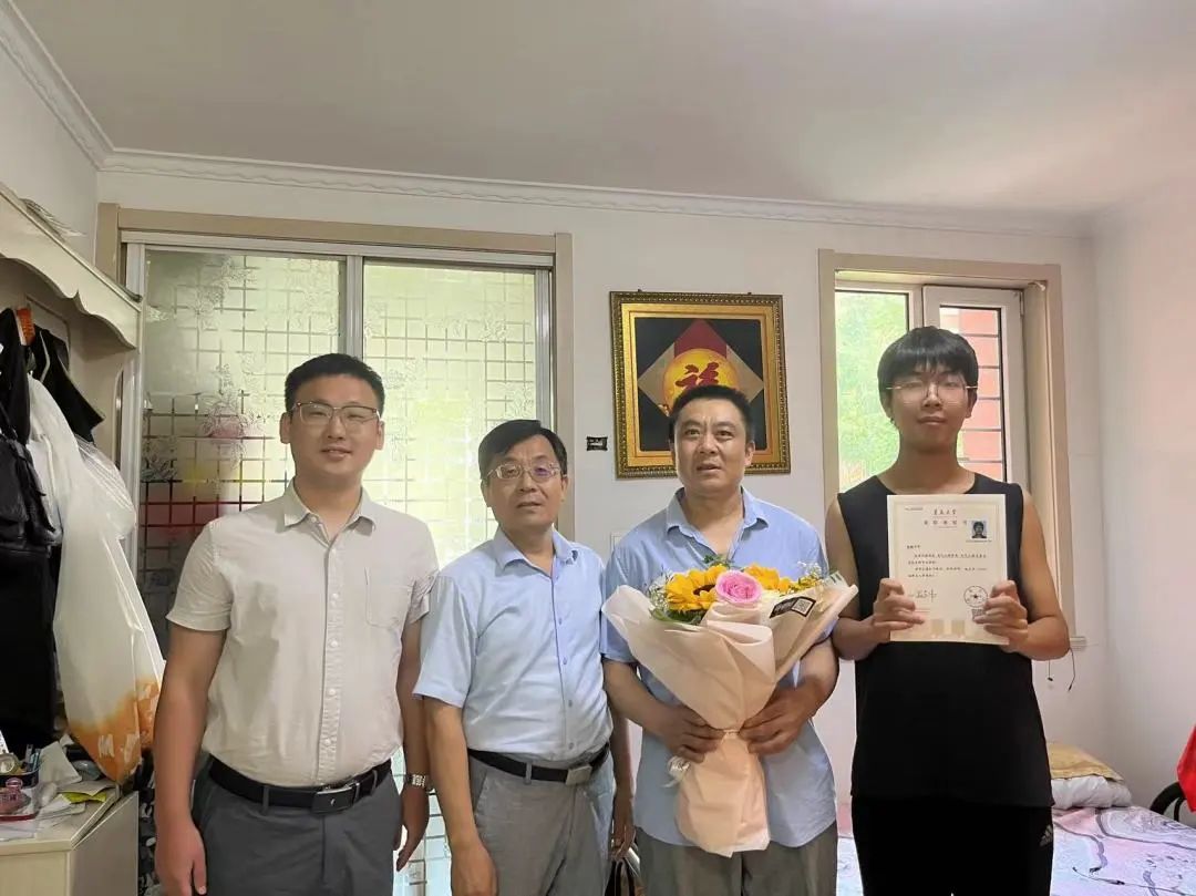 8月2日上午,受学校招生办委托,学院党委副书记薛希洪、辅导员刘董前往胶州市,将校长夏东伟亲笔签发的学院第一份本科生录取通知书第一时间送到2023级新生杨鹏手中。